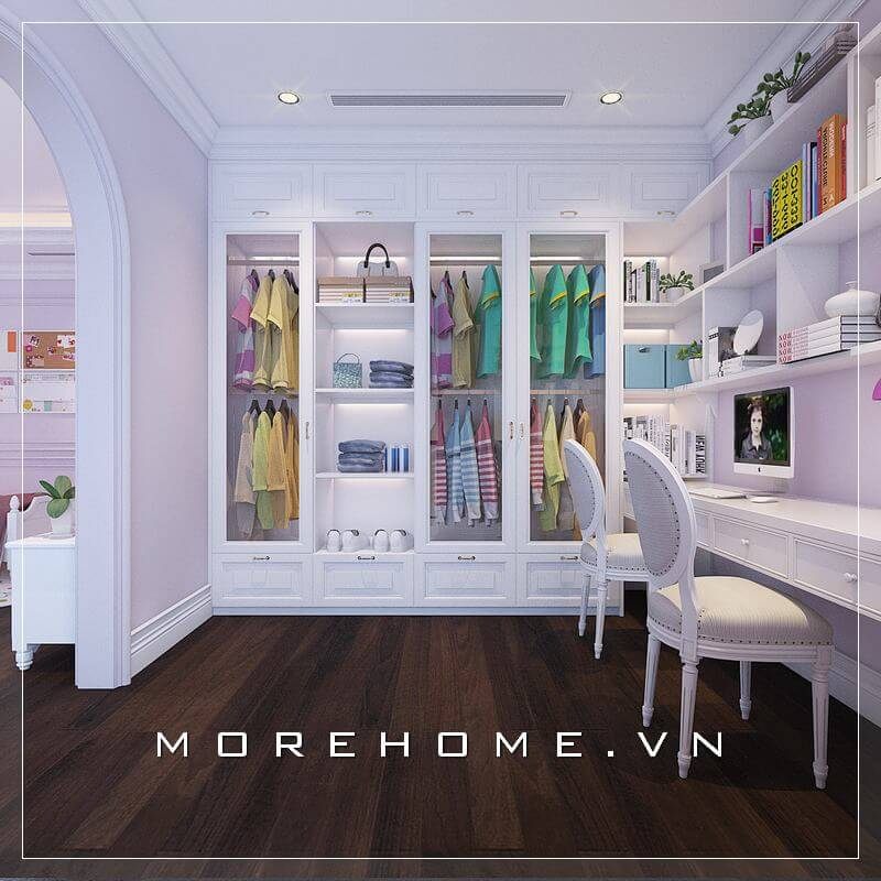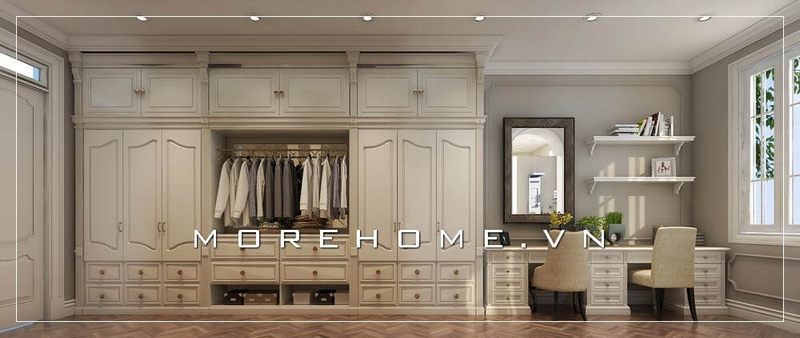 Cùng chiêm ngưỡng mẫu tủ quần áo gỗ phong cách tân cổ điển màu trắng sang trọng đến từ KTS Morehome