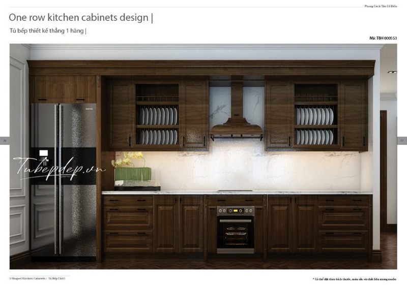 Tủ bếp gỗ óc chó nhập khẩu được thiết kế chữ i đơn giản hay không cầu kỳ mà vẫn phải đáp ứng đầy đủ công năng sử dụng, thỏa mãn tính thẩm mỹ lại rất gọn gàng bắt mắt, thể hiện đẳng cấp của gia chủ