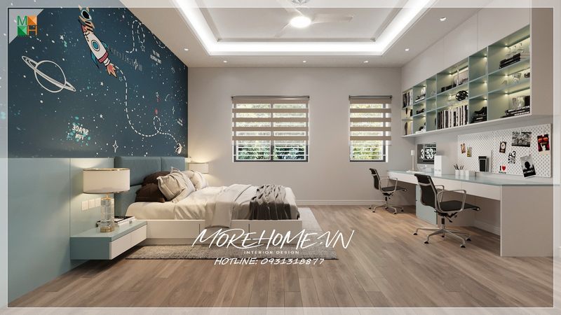 Phòng ngủ bé trai của bạn sẽ trở nên đẹp mắt hơn khi được trang trí bằng tranh dán tường 3D vũ trụ. Nếu con bạn thích phong cách này, hãy liên hệ với Morehome để được tư vấn và sở hữu nhé.