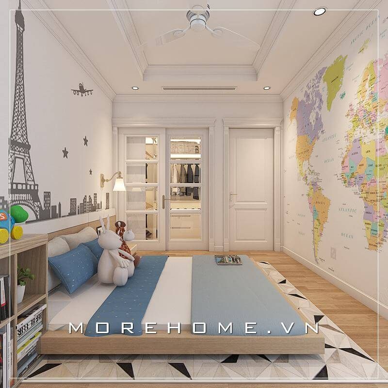 Nội thất phòng ngủ trẻ em hiện đại được trang trí bằng các bản đồ địa lý dán trên tường, giúp cho các bé cảm thấy hứng thú hơn khi học.